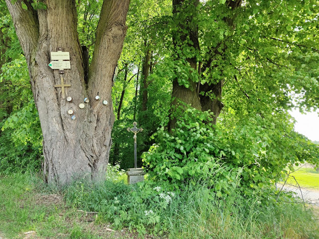 stromy zmerčil jsem nevelký křížek. Na stromě s rozcestníkem, po levé
